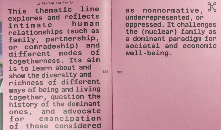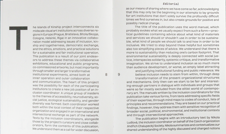 “This comprehensive publication is the result of a two-year collaboration within the platform Islands of Kinship, which interconnects six mid-scale visual art institutions across diverse regions in Europe (Prague, Bratislava, Bitola/Skopje, Cologne, Helsinki, Riga). The project represents an innovative model of collaboration addressing issues of inclusion, kinship and togetherness, democratic exchange, and the ethics, emotions, and practical solutions needed for fair and sustainable institutional operations.