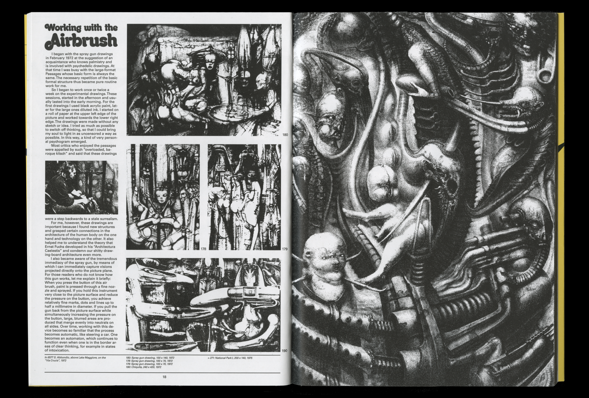 This book was the first major compendium of Giger's artworks and contains texts written by Giger on his early life, influences, subject matter among other topics.
