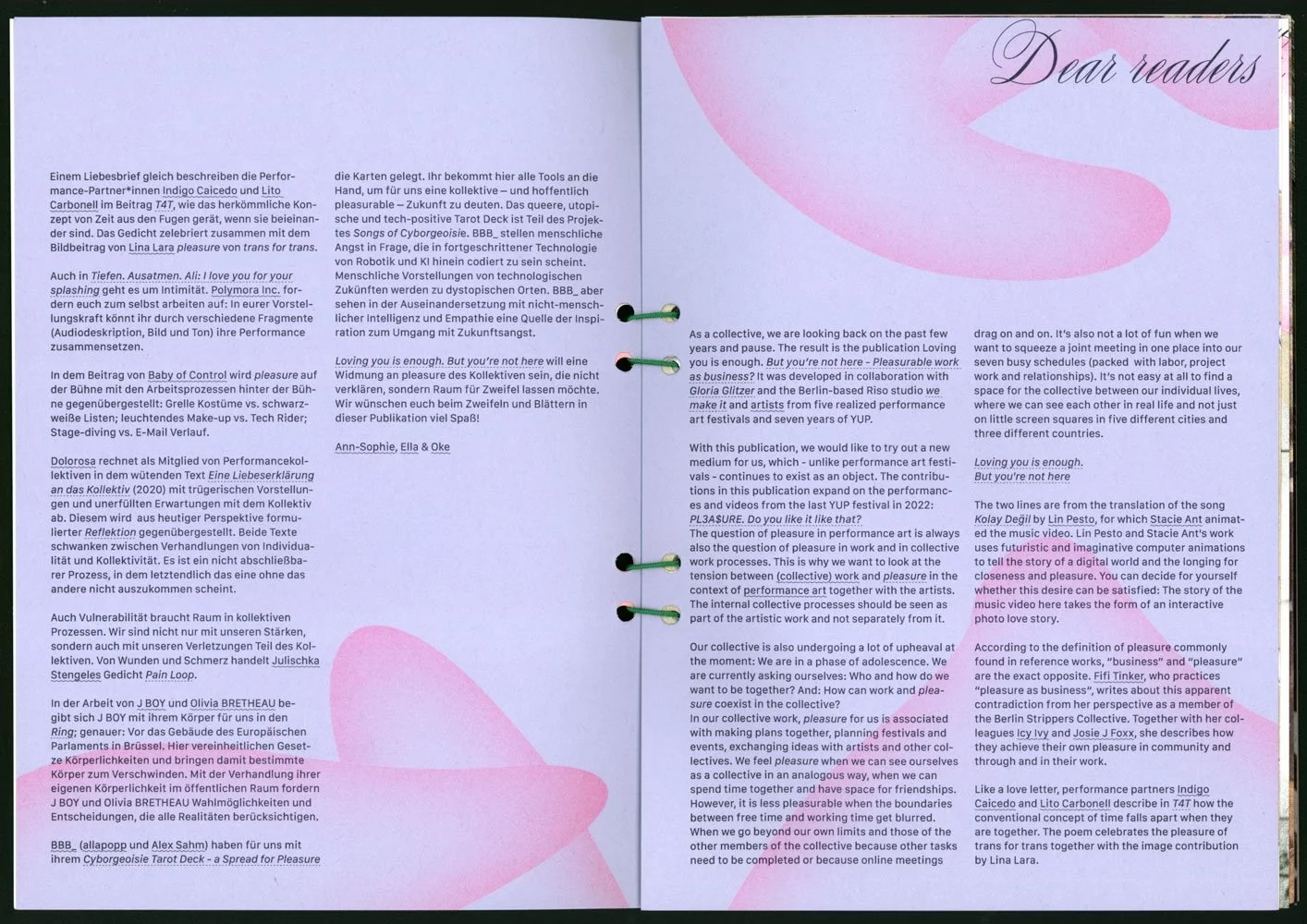 Loving you is enough… is a publication that reflects the collective processes of seven years of YUP in form of an experimental and interactive experience. It brings together seven different contributions by artists from the past five realized performance art festivals.