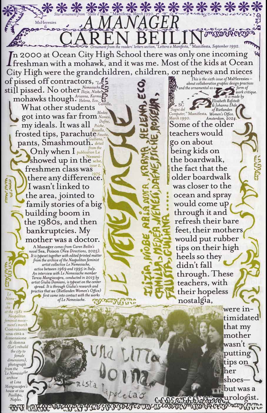 “In this sixth issue they publish A Manager from Caren Beilin’s novel Sea, Poison (New Directions, 2025). It is typeset together with reworked, edited printed matter from the archive of the Neapolitan feminist artist collective Le Nemesiache, active between 1969 and 1995 in Italy. An interview with Le Nemesiache member Teresa Mangiacapra, conducted in 2013 by artist Giulia Damiani, is typeset on the center spread.”