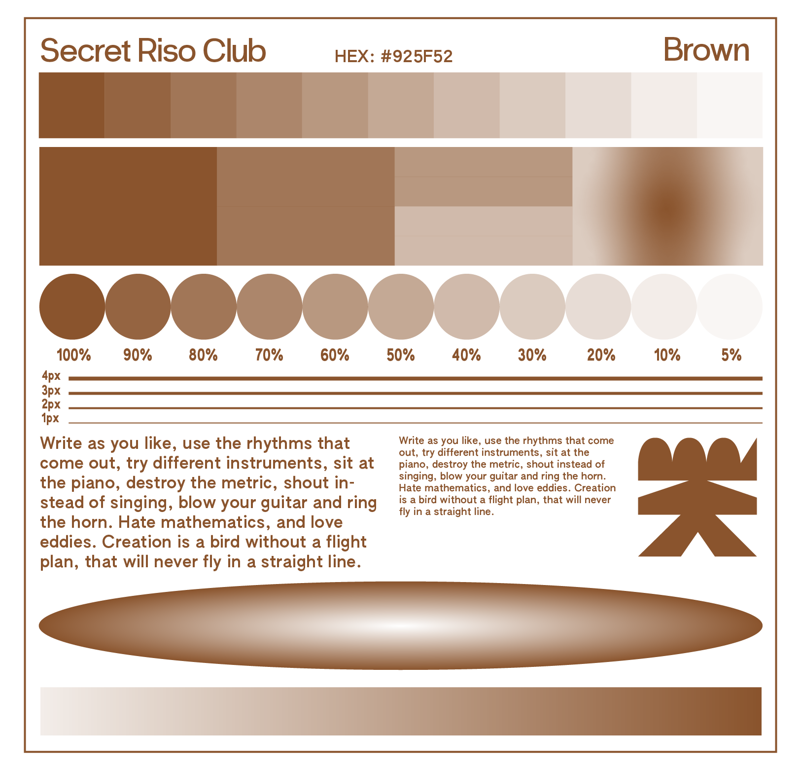 Due to the quirks of Riso, avoid large areas of solid color (they should be at max 50% opacity). Be sure to send us a full color JPEG or PDF as a reference. If attempting to print large blocks for solid ink, coverage might vary slightly, and there may be differences in gradation.