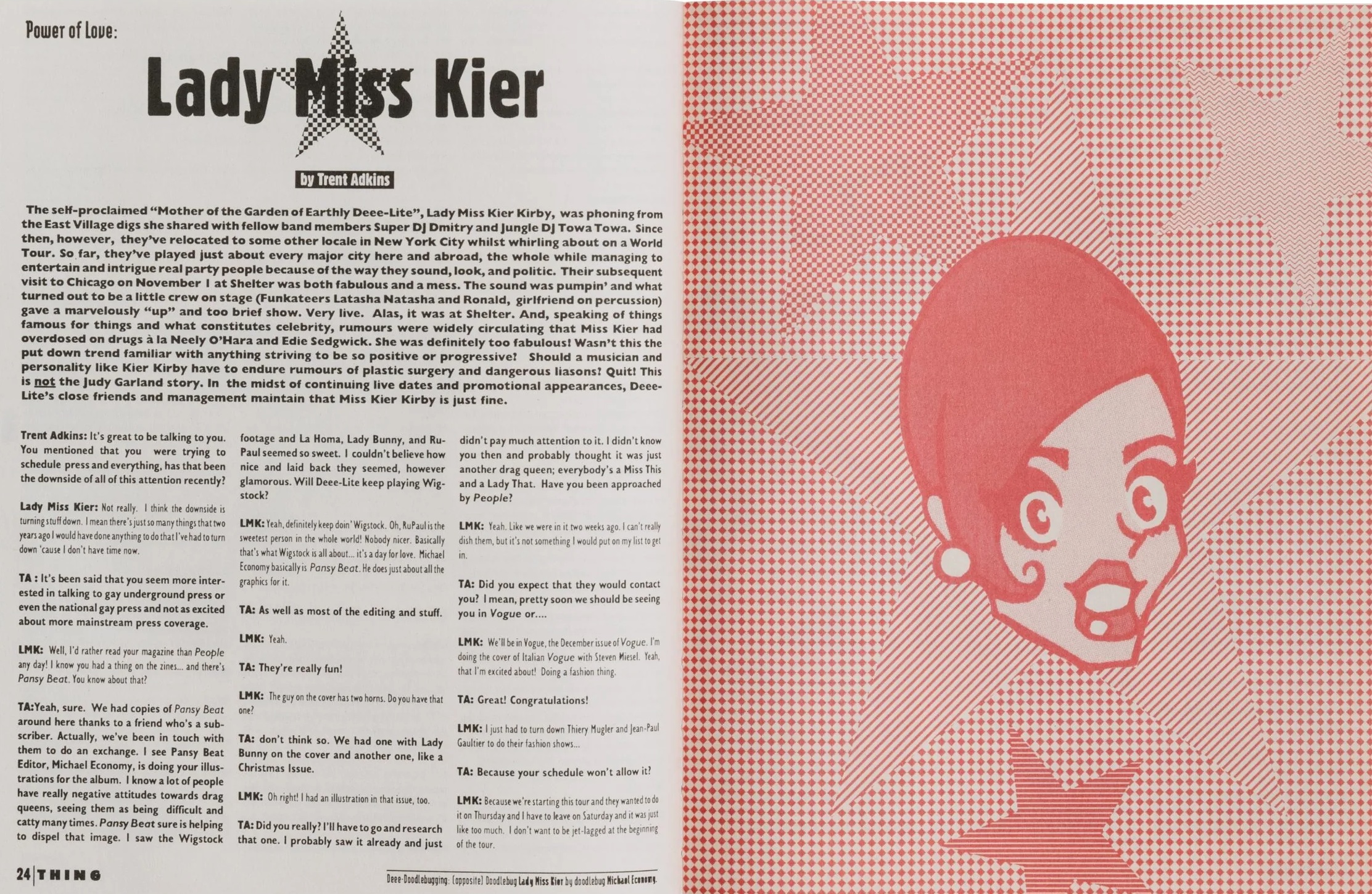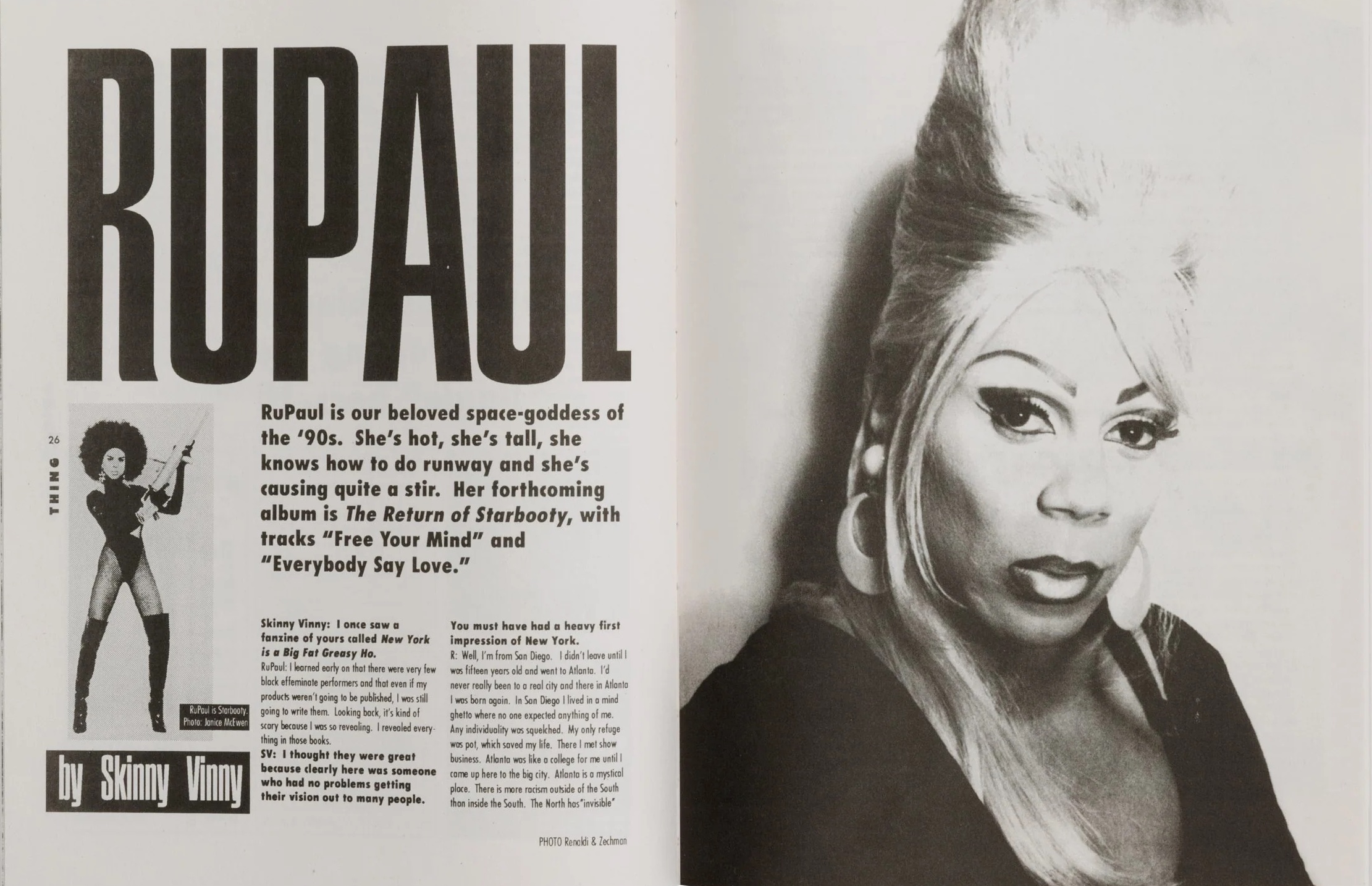 The magazine included contributions from Trent D. Adkins, Joey Arias, Aaron Avant Garde, Ed Bailey, Freddie Bain, Basscut, Belasco, Joan Jett Blakk, Simone Bouyer, Lady Bunny, Bunny & Pussy, Derrick Carter, Fire Chick, Chicklet, Stephanie Coleman, Bill Coleman, Lee Collins, Gregory Conerly, Mark Contratto, Dennis Cooper, Dorian Corey, Ed Crosby, The Darva, Vaginal Davis, Deee-Lite, Tor Dettwiler, Riley Evans, Evil, The Fabulous Pop Tarts, Mark Farina, Larry Flick, Robert Ford, Scott Free, David Gandy, Gemini, Gabriel Gomez, Roy Gonsalves, Chuck Gonzales, Tony Greene, André Halmon, Lyle Ashton Harris, Larry Heard, Essex Hemphill, Kathryn Hixson, Sterling Houston, Ishmael Houston-Jones, Gary Indiana, Candy J, Jamoo, Jazzmun, Gant Johnson, Owen Keehnen, Lady Miss Kier, Spencer Kincy, Iris Kit, Erin Krystle, Steve LaFreniere, Larvetta Larvon, Marc Loveless, Lypsinka, Malone, Marjorie Marginal, Terry A. Martin, Rodney McCoy Jr., Alan Miller, Bobby Miller, Michael Musto, Ultra Naté, Willi Ninja, Scott “Spunk” O’Hara, DeAundra Peek, Earl Pleasure, Marlon Riggs, Robert Rodi, Todd Roulette, RuPaul, Chantay Savage, David Sedaris, Rosser Shymanski, Larry Tee, Voice Farm, Lawrence D. Warren, Martha Wash, LeRoy Whitfield, Stephen Winter, David Wojnarowicz, and Hector Xtravaganza.