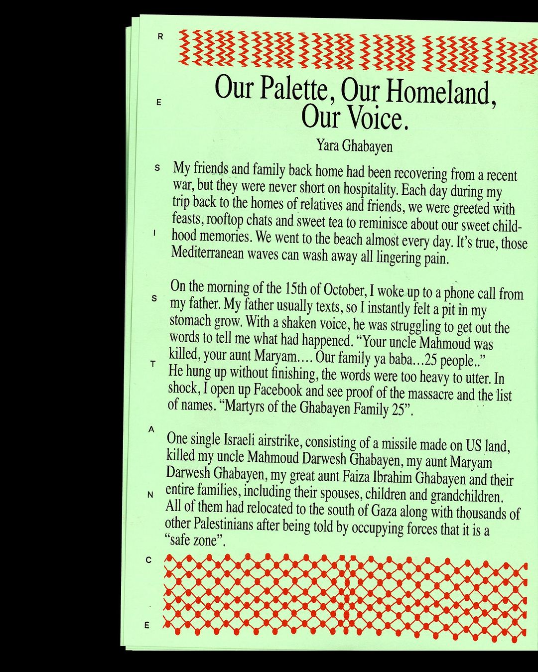 The Resistance Zine a documentation and expansion of Palestinian, SWANA and Arab visual culture, language and art. Highlighting the subtle and explicit ways we communicate with each other within our shared cultural understanding and artistic synergy and the juxtaposition of the way the Western world views and depicts us. Examined and explored from a historical and contemporary lens.
