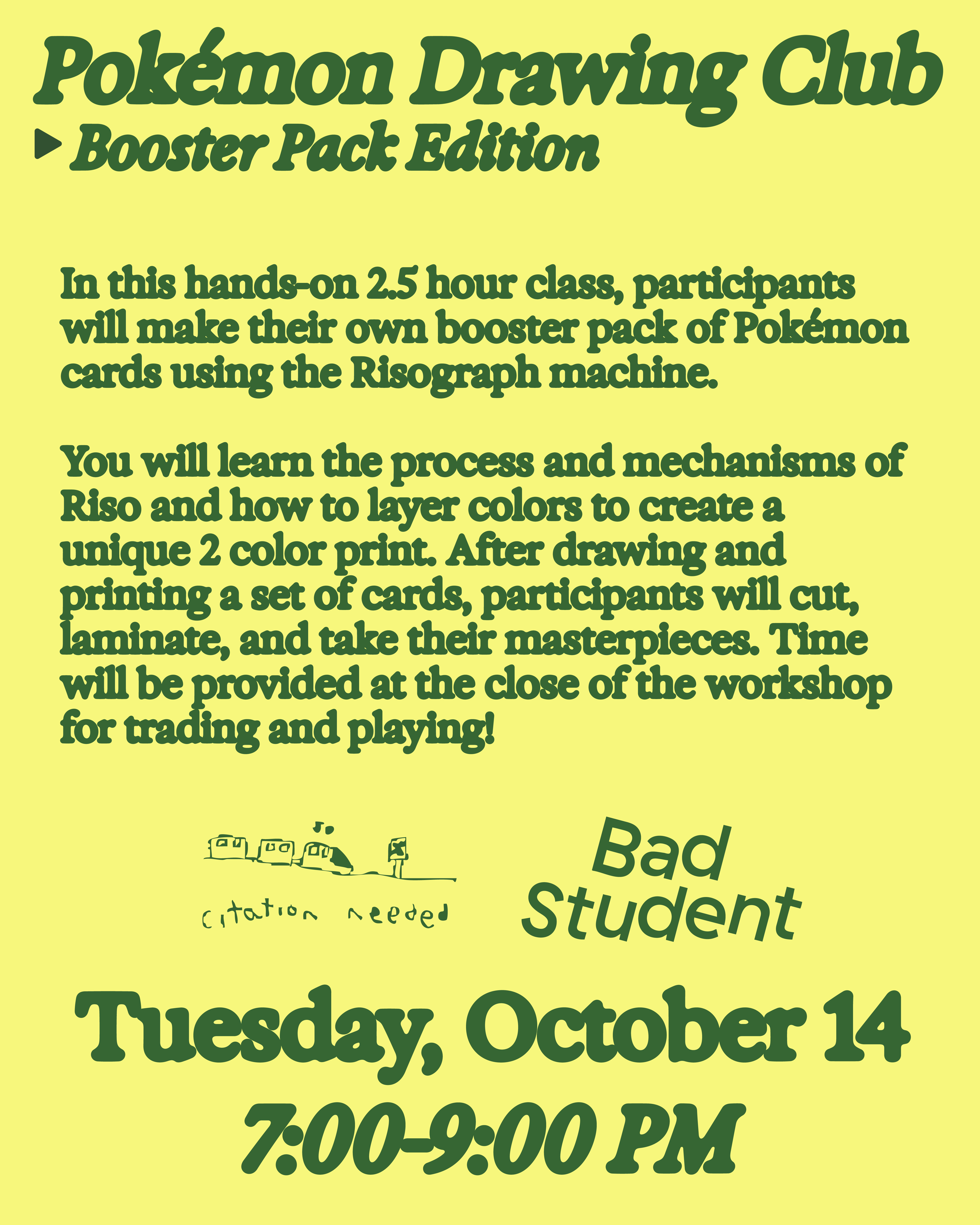 In this hands-on 2.5 hour class, participants will create their own booster pack of Pokémon cards using illustration and the Risograph machine. You will learn the process and mechanisms of Riso, and how to layer colors to produce a unique set of two-color prints. After drawing and printing half a pack of cards, participants will be invited to cut and decorate their cards. The workshop will close with time for trading!