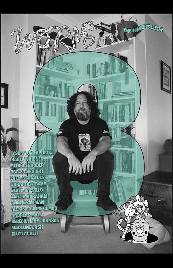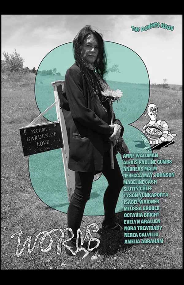 In this special edition, double-cover issue of Worms, we bring you not one, but two cover stars. The indelible Tyson Yunkaporta and the iconic Anne Waldman adorn both sides of Worms 8 which can also be thought of as ‘The Elements Issue’. It was dreamt up in a dreary and grey August in London, while the rest of the world suffered through the hottest days on record. As we witnessed, and continue to witness, such climate catastrophe, we turned to the literature we love to help us understand, to challenge us, and to offer us some comfort.